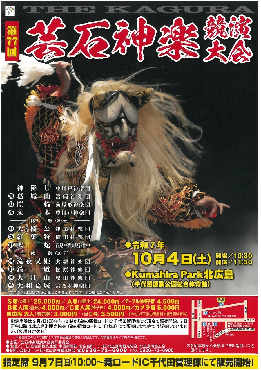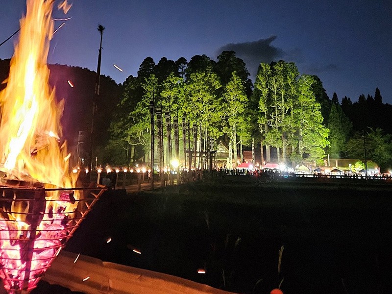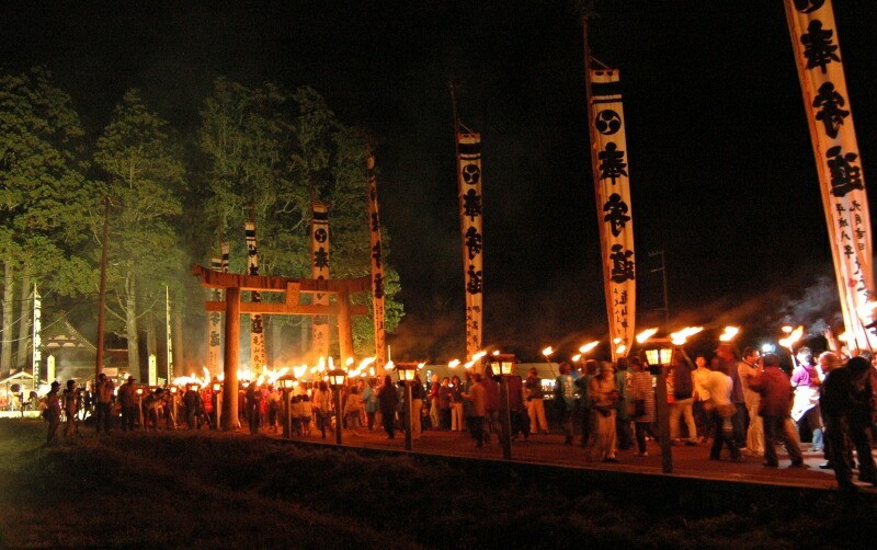 神職や獅子舞、御神輿などが列をなす「御神幸」のほか、雄鹿原合戦で石見国今市城主福屋勢が、松の木にたいまつを結び、軍勢多勢にみせかけたという言い伝えになぞらえて、夜には松明を持った武士たちが歩く松明行列が見られます。