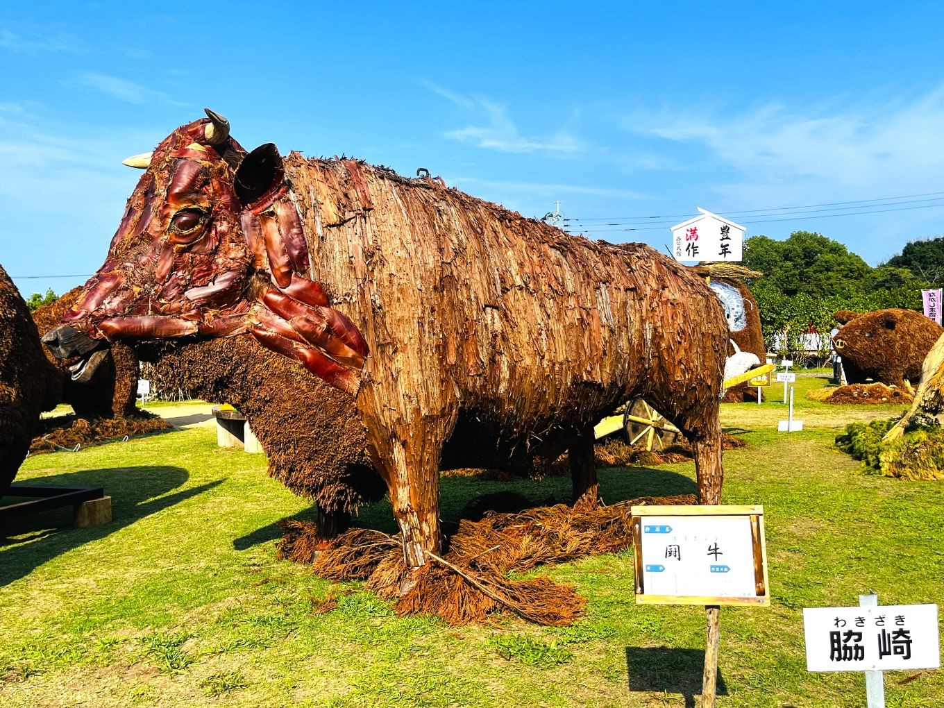 長島町民が一丸となって、自然の素材(スギや竹など)や廃材(空き缶、ペットボトルや貝殻など)を利用して制作。