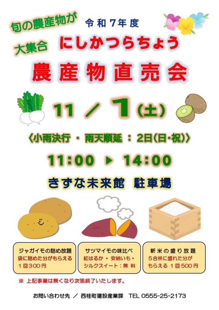 にしかつらちょう農産物直売会を開催します!(お問合せは、町建設産業課)