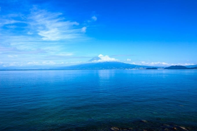 空と海の青が冴えわたる秋晴れの日の富士山。