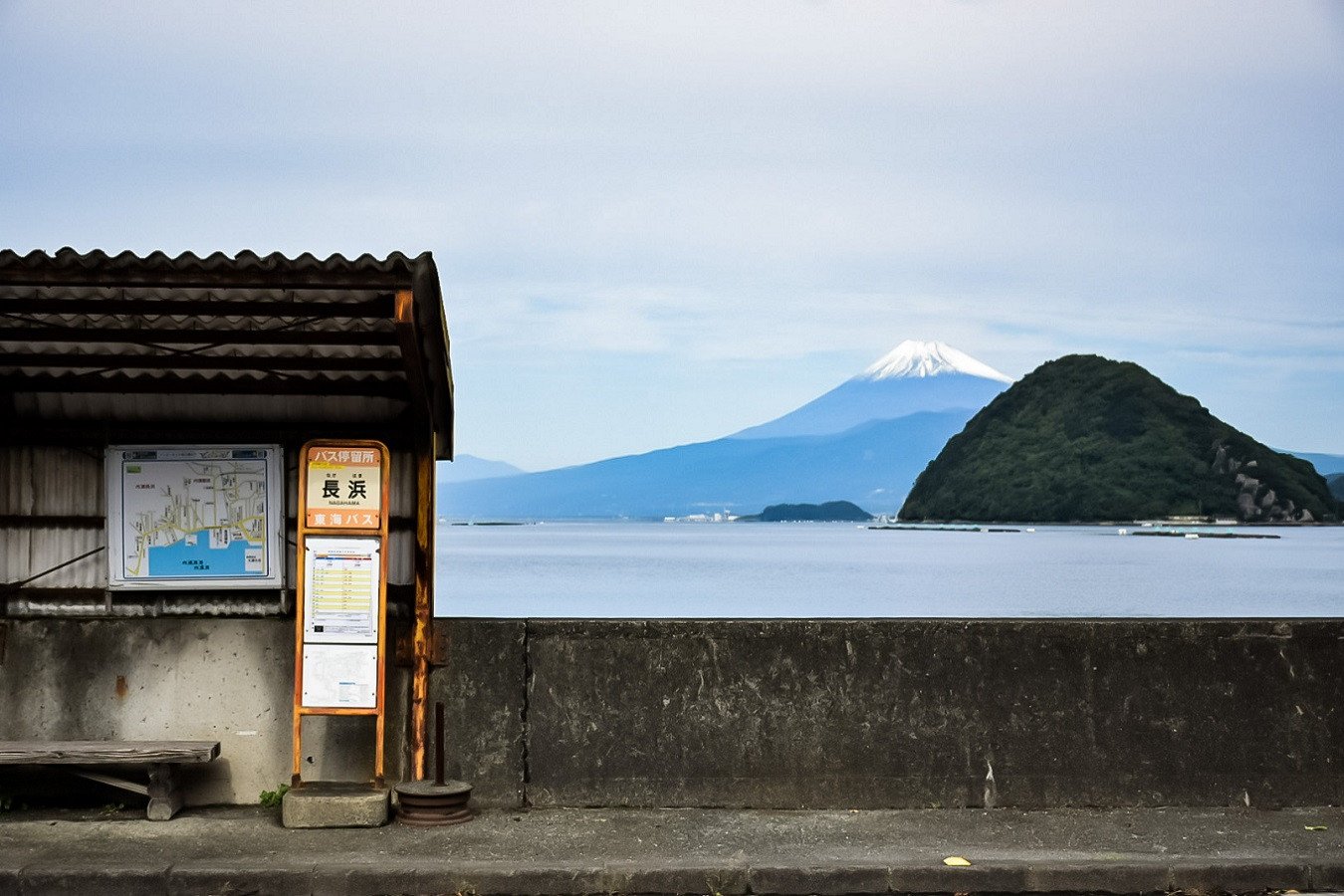 冠雪した富士山と長浜バス停。