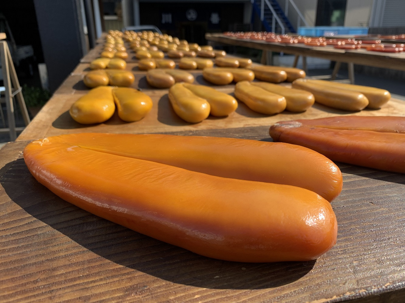 沼津港入口のほど近くに並ぶ琥珀色の列。明治44年創業の老舗「川善」さんの店頭で、この時期行われている、本からすみの乾燥作業の様子です。