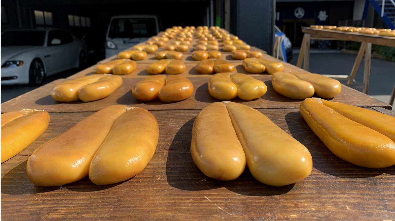 2週間ほど乾燥させた本からすみは、クリーム色から濃い琥珀色に。オリーブオイルで磨いて仕上げます。