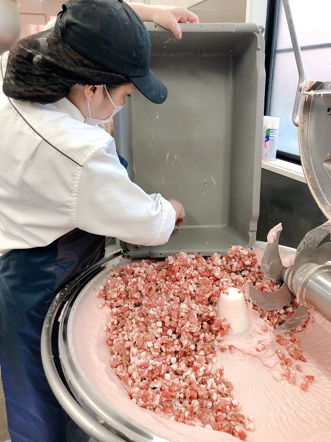 六枚刃の機械で、まずは赤身をしっかり混ぜ、その後脂肪を追加し、しっかりと乳化させて作るそう。