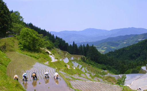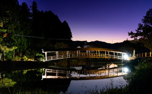 町の中心部から少し足をのばすと、棚田や屋根付き橋、水車小屋など美しい里山の風景が広がっています。