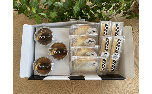 岩瀬牧場の新鮮なミルクをふんだんに使用した厳選スイーツのセットです。ふわふわのスポンジ生地の軽やかな食感とミルク風味のクリームが相性バッチリ!な「ロールケーキ」や、チーズケーキ好きにおすすめの濃厚なスティックケーキ「チーズスティック」、表面のキャラメリーゼがアクセントの「カタラーナ」の3種類を楽しめます。