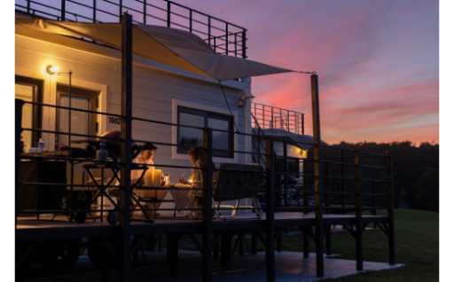 トレーラーハウスは、客室、ウッドデッキ、ルーフテラスで構成されています。