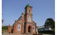 1918年建設。国の重要文化財に指定された赤レンガ造りの教会堂正面には、荘厳な鐘塔がそびえています。