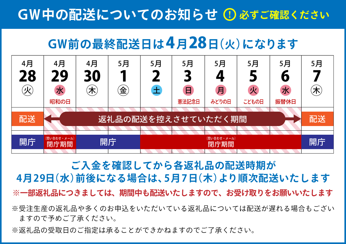 | 2026/04/13(月) 16:03 | ゴールデンウィーク期間中の配送に関するお知らせ【必ずご確認ください】 ゴールデンウィーク期間中(4月29日~5月6日)の配送に関するお知らせ |