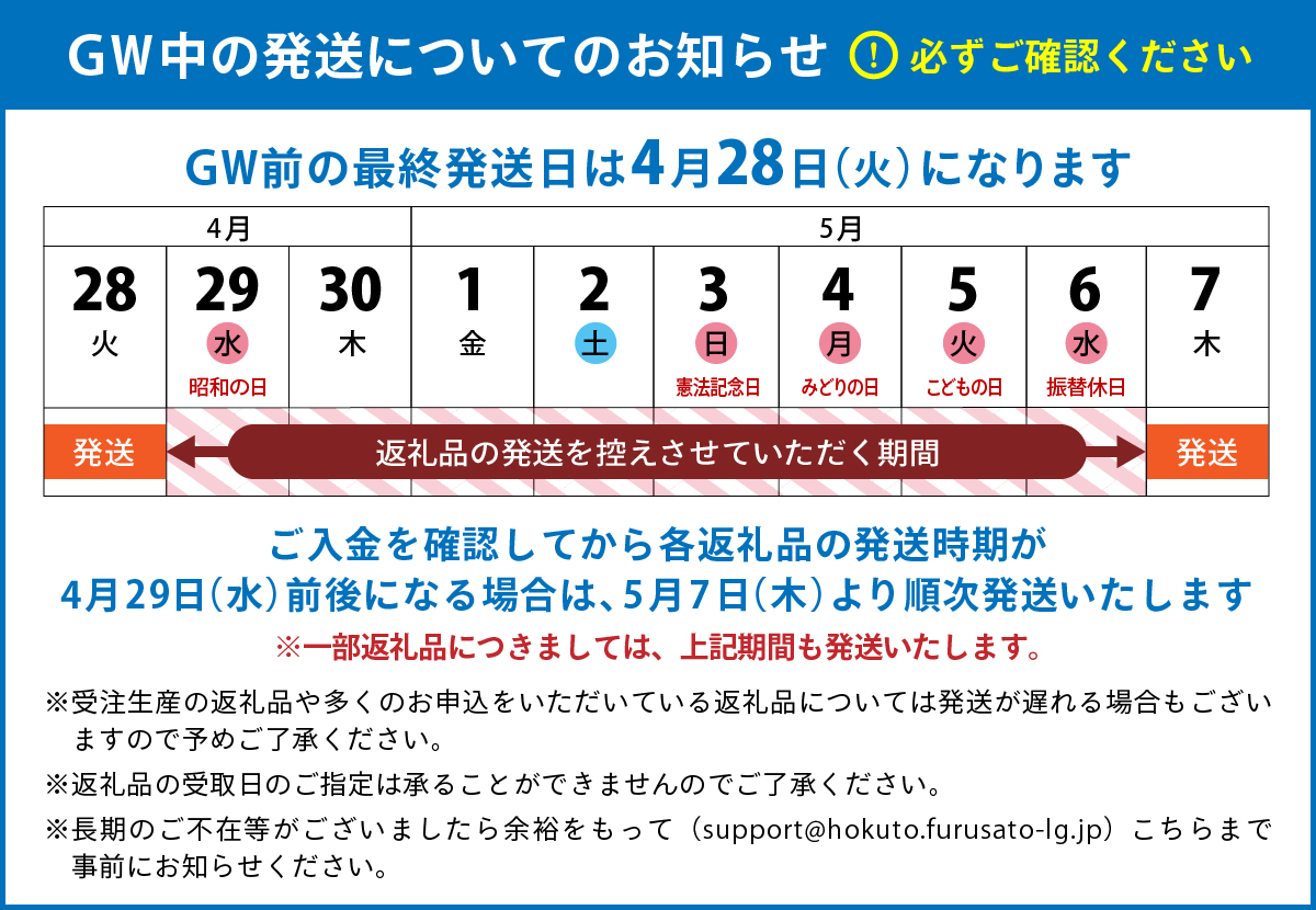 北杜市よりGWの返礼品発送スケジュールについてご案内いたします。 大切なお知らせとなりますので、必ずご確認をお願いいたします。 |