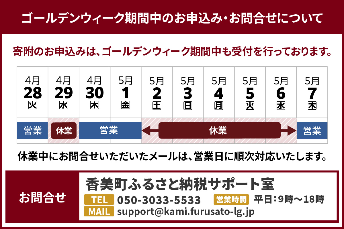 ◆ゴールデンウィーク期間中のお申込み・お問合せについて 寄附のお申込みは、ゴールデンウィーク期間中も受付を行っております。 休業日にお問合せいただいたメールは、営業日に順次対応いたします。 ■営業・休業日 営業日:4月27日、4月28日、4月30日、5月1日、5月7日~ 休業日:4月29日、5月2日~5月6日 ■お問合せ 香美町ふるさと納税サポート室 TEL:050-3033-5533 MAIL:support@kami.furusato-lg.jp 営業:平日9時~18時 |