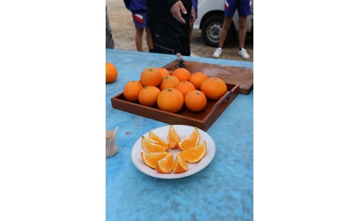 収穫した愛果28号はその場でカットして試食。甘さも十分あり、酸味も程よくおいしいみかんでした!