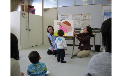保健センターに指導員が行き2才児とその親の前で歯磨きや親子遊びの指導を行っております。紙芝居方式でどのように磨くか細かく指導します。