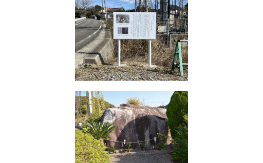 この巨石には弁財天の梵字が刻まれており、祀られています。水害の時にそのままの状態で、約100m流され、この地に鎮座したもので、数少ない災害遺構として、後世に引き継ぐために説明看板を設置しました。