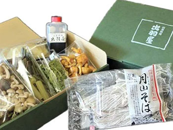 「出羽屋」から届く、月山そばと10種類以上の山菜・きのこのセットです。「出羽屋」は山菜そば発祥のお店。こだわり抜いた山菜と伝統の味を存分に楽しめます。季節によって具材が変わるので、旬の味わいを楽しめるのも魅力です。