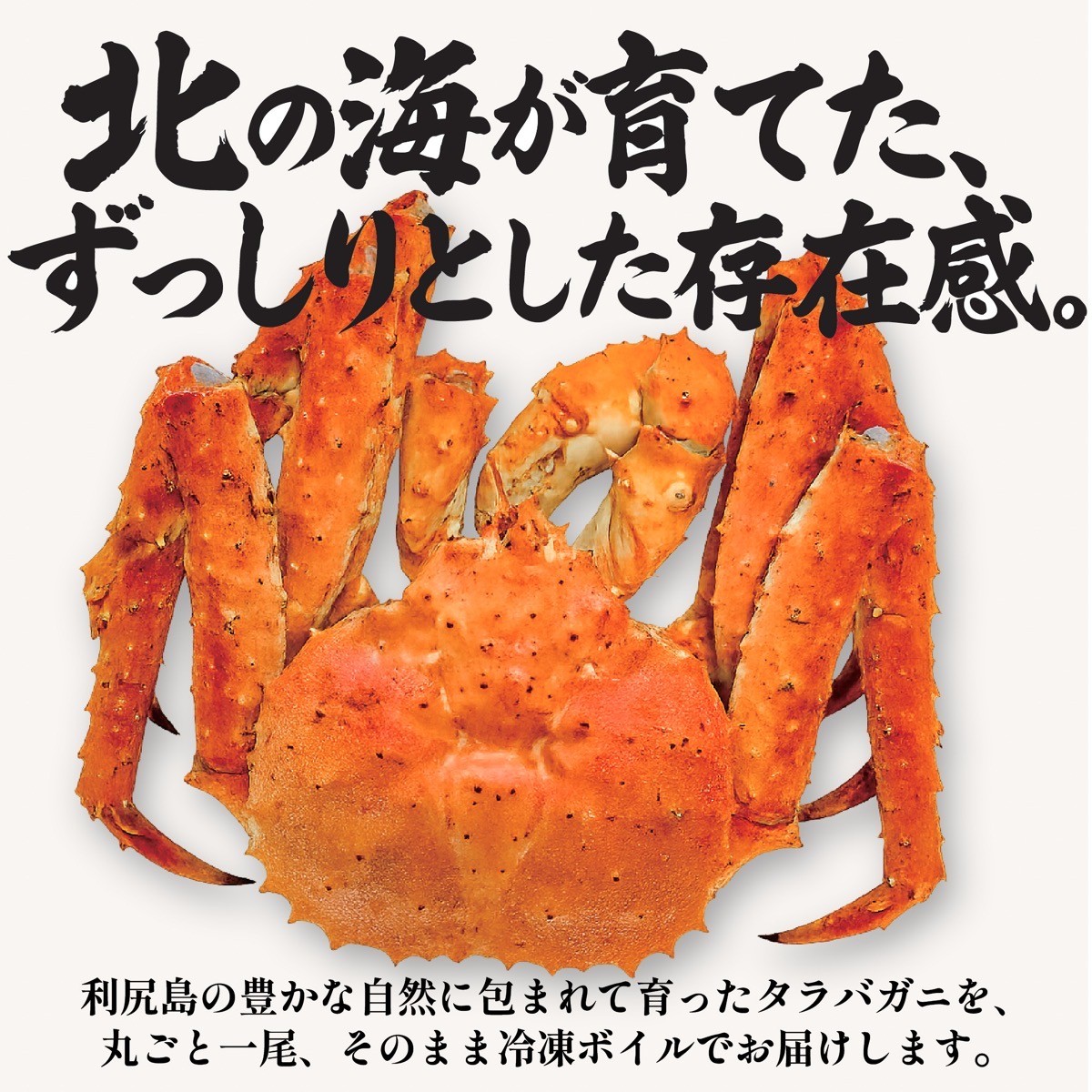 利尻島の豊かな自然に包まれて育った特大サイズのタラバガニを、丸ごと一尾、そのまま冷凍ボイルでお届けします。