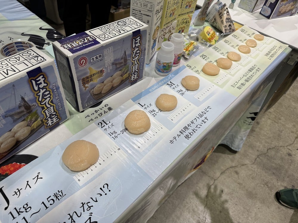 実物大のほたての見本を展示し、サイズの違いを実際に体感いただけるコーナーを設けました。