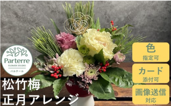 パルテール 正月用 松竹梅フラワーアレンジメント 12/25までの受付で年内配送 縁起が良いとされる松竹梅を用いてアレンジしたお花をお届けいたします。色合いやお花のご要望がある場合もご対応可能で、ギフト用途のお届けも致しております。素敵な正月を迎えるにあたりおすすめです。 12/18までのご決済の場合のみ12/26~31の着指定を承れます。