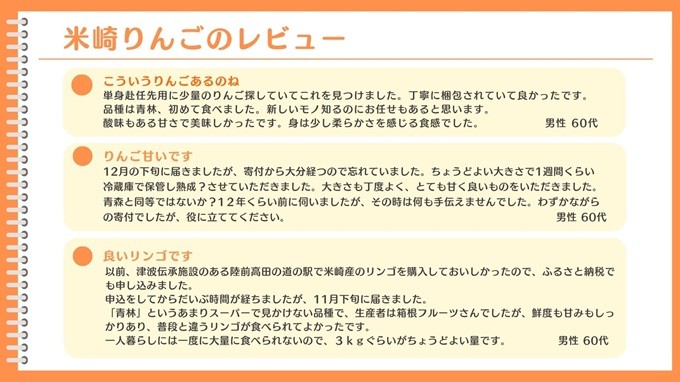 リアス式海岸と山の間の傾斜地に広がる岩手県陸前高田市米崎町で生産される、100年以上の歴史あるりんごです。水はけの良い土壌のもと、海からの風と陽の光をたっぷり浴びて育っています。他のりんご産地と比べると霜がおりるのが遅いので長期に渡って栄養を吸い上げており、味がしっかり入ったジューシーなりんごができあがります。丹精込めて大切に育てた米崎りんご。全国のみなさまにお召し上がりいただけると嬉しいです!