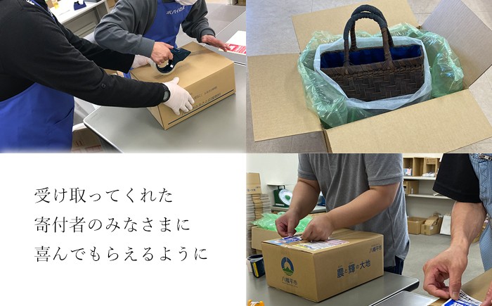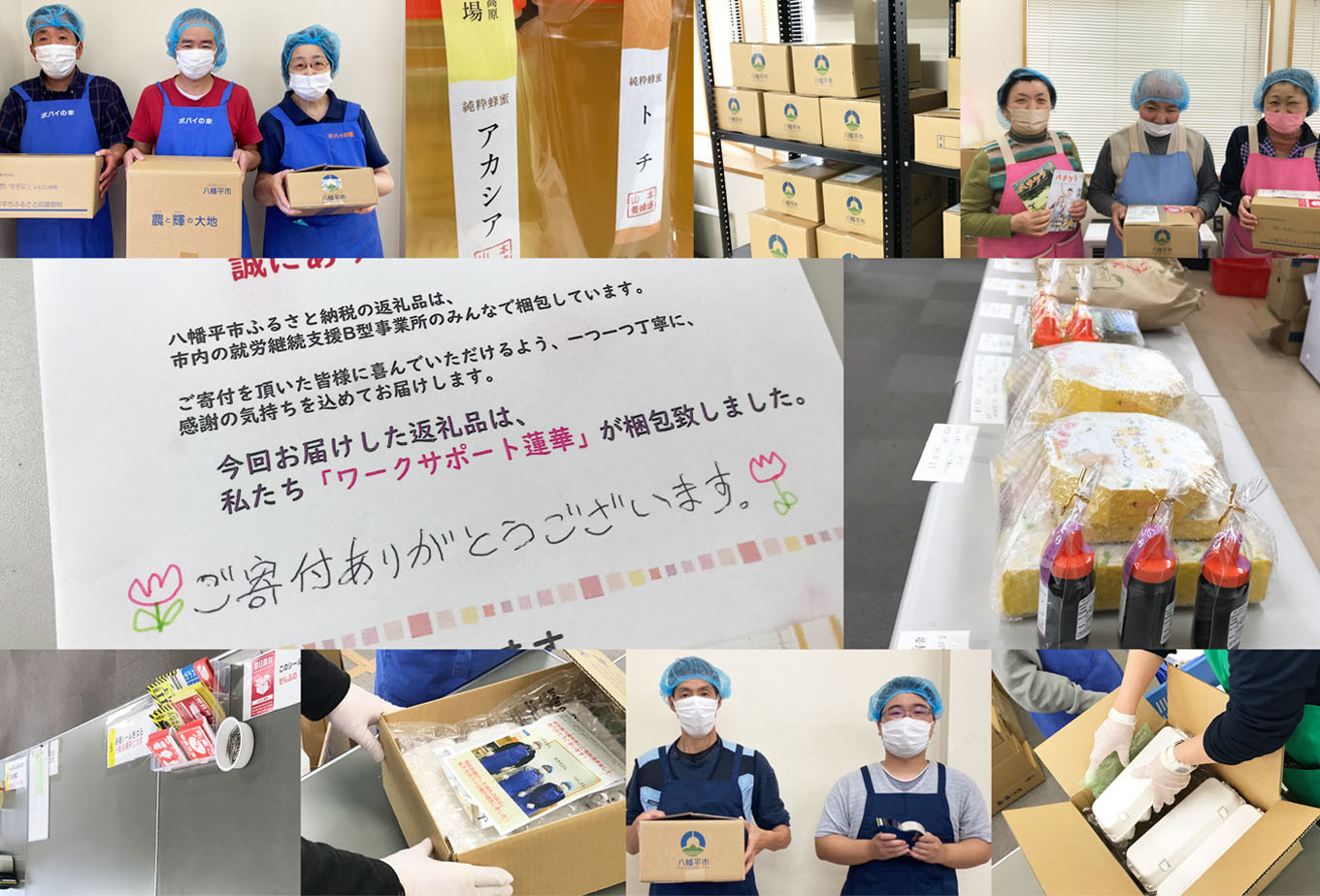 八幡平市では、ふるさと納税の返礼品の一部の梱包作業を、八幡平市内にある就労継続支援B型事業所(そよかぜの家・ポパイの家・ワークサポート蓮華)に通う人たちが行っています。 全国の皆さんから寄付を頂いたことで生まれた仕事を通じて、障害を持っていてもやりがいを感じながら働く環境づくりに努めています。 作業は、指導員のサポートを受けながら、自ら伝票や商品を確認し、商品に合った段ボールを組み立て、緩衝材を入れ、一つ一つ丁寧に感謝の気持ちを込めて梱包しています。