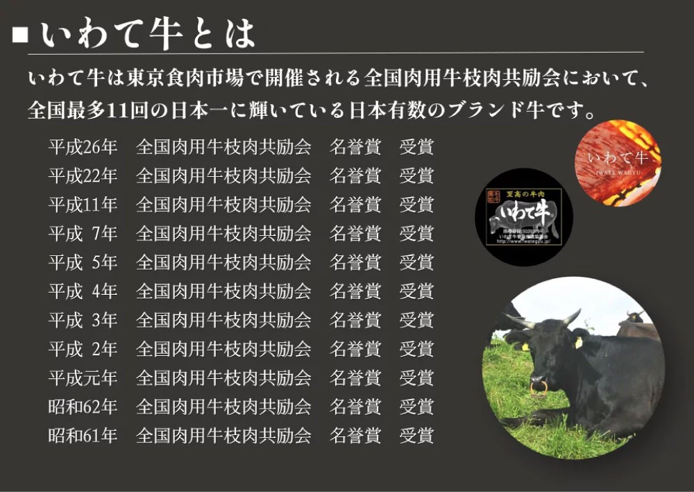 いわて牛は東京食肉市場で開催される全国肉用牛枝肉共励会において、全国最多11回の日本一に輝いている日本最高級のブランド牛です。 ※昭和61年~62年、平成元年~5年、平成7年、平成11年、平成22年、平成26年 全国肉用牛枝肉共励会 名誉賞を受賞 県内各地では、全国屈指の知名度を誇る「前沢牛」をはじめ、「いわて江刺牛」、「いわて奥州牛」など、名立たる地域銘柄牛が充実しており、これらも全て「いわて牛」を支えるブランド牛の一つです。