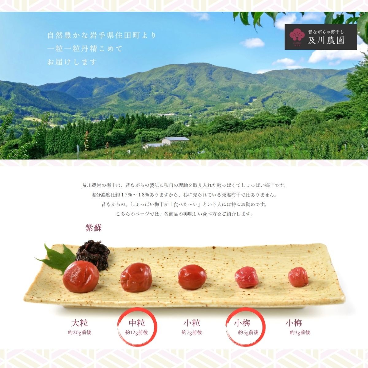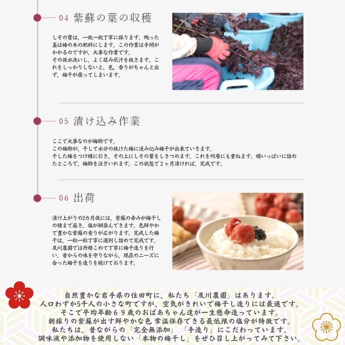 自然豊かな岩手県の住田町に、私たち「及川農園」はあります。人口わずか5千人の小さな町ですが、空気がきれいで梅干し造りには最適です。そこで平均年齢69歳のおばあちゃん達が一生懸命造っています。朝採りの紫蘇が出す鮮やかな色 常温保存できる最低限の塩分、私たちは、昔ながらの「完全無添加」 「手造り」にこだわっています。調味液や添加物を使用しない「本物の梅干し」をぜひ召し上がってみて下さい。