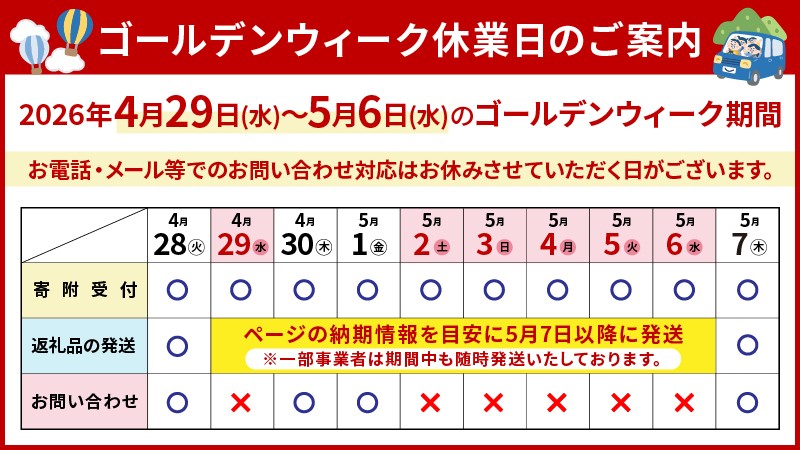 いつも秋田市を応援いただき、ありがとうございます。 ゴールデンウィーク期間中(4月29日~5月6日)、お問い合わせセンターはカレンダー通りにお休みをいただきます。 4月30日、5月1日は通常営業となります。 なお、返礼品は発送元事業者のお休みにより発送時期は異なりますが、 4月30日以降のお申し込みは5月7日以降の発送となる場合がございます。 何卒ご了承くださいますようお願いいたします。