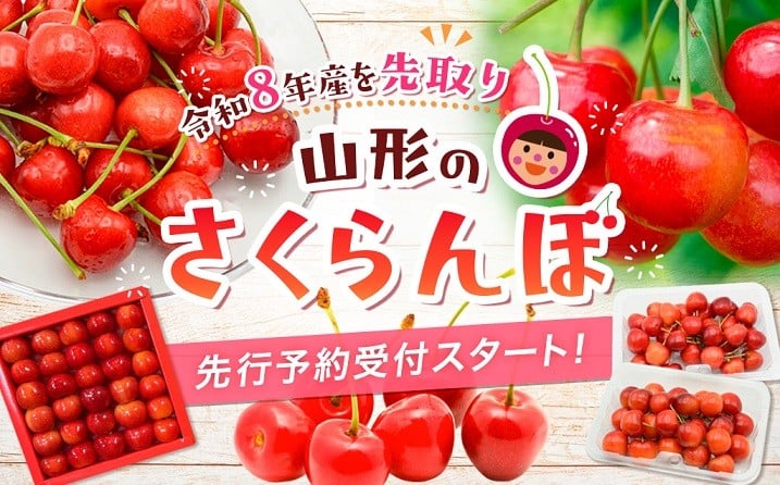 山形が誇る初夏の果物。さくらんぼ【やまがた紅王】をいち早くお届けします。こちらは、温室栽培の為、通常のさくらんぼより約1ヶ月早いお届けになります。 【やまがた紅王】は、山形県が20年以上の歳月をかけて開発して2023年に本格デビューを果たした大粒のさくらんぼです。 その為、まだまだ知らない方もいるはず。大粒で、宝石のような鮮やかな紅色と上品な甘さが特徴です。 美しい見た目と美味しさを味わっていただきたい為、一粒一粒吟味しながら丁寧に手詰めをしておりますので、特別な日のデザートや贈り物におすすめです。 場合により、箱のデザイン等変わることがございます。 事業者:株式会社山美ファーム ◆必ずお読みください◆ ◎お受け取り後はすぐに中身をご確認ください。 ◎さくらんぼは旬の短い大変デリケートな果物ですので、到着後早めのお受け取りとご確認にご協力ください。 発送可能な期間は品種ごとに約2週間程度となっておりますので、その旨をご了承の上お申し込みをお願い致します。 ◎天候や収穫等の状況によりご希望のお品をご用意できない場合であっても、税金の控除等に影響の無いよう、代替品をご用意致します。 (すでに税金の控除等を受けている方への返金は確定申告や修正申告が必要となる場合があります。) ◎「お申し込みの不備」「事前連絡をいただいていない長期不在や転居」「住所不明」「日数が経ってからのお受取り」に対する再出荷は致しかねますのでご了承ください。 ※沖縄・離島への配送は不可とさせていただきます。 ※季節商品のため、お礼の品の配送日の指定は承っておりません。 ※天候や収穫状況により、お届けや規格が変更になる場合がございます。 ※配送時の揺れや傾きにより若干の傷が生じる場合がございます。 ※画像はイメージです。画像のものと多少異なる場合があります。 ※お礼の品の発送には万全を期しておりますが、万が一ひどい傷み等があった場合は、写真・画像を添付の上お早めに「山形市ふるさと納税お礼の品事務局」までご連絡ください。尚、お時間が過ぎてからの対応は致しかねます。