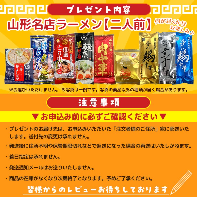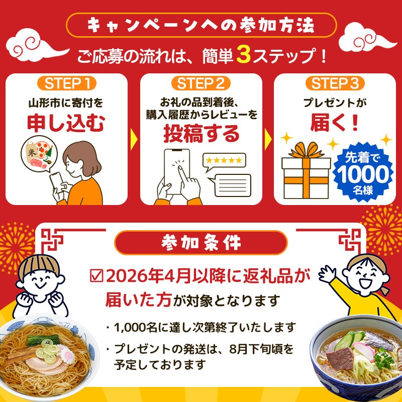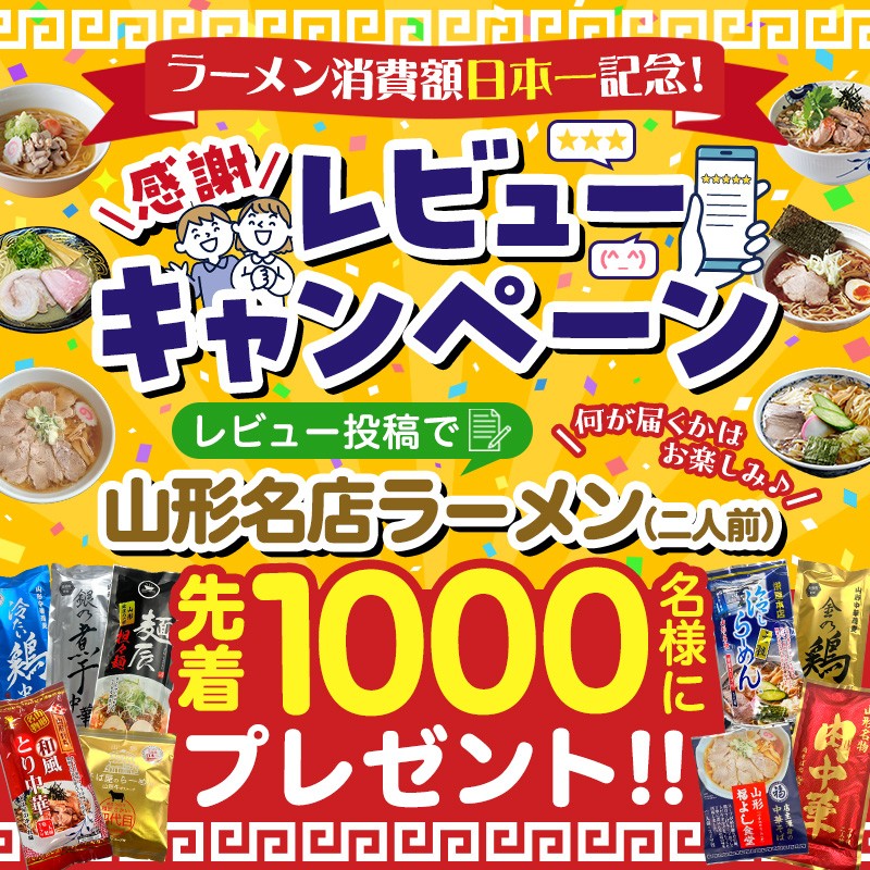 いつも山形市を応援いただき、誠にありがとうございます。 おかげさまで山形市は今年もラーメン消費額日本一となりました! これを記念し、レビュー投稿キャンペーンを実施しております♪ ぜひ、返礼品のご感想やご意見をレビューとしてお寄せください。 皆さまからいただいた貴重なお声は、今後の品質向上やサービス改善に活かしてまいります。 なお、レビューをご投稿いただいた方には、ささやかなプレゼントをご用意しております。 ぜひこの機会にご参加ください!