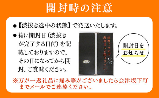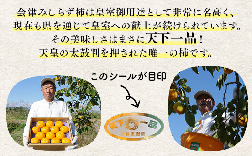 会津みしらず柿を作り続けて半世紀。 高級感のある漆黒の箱に黄金に輝く【天下一品】のシールを掲げお届けします。 会津みしらず柿は渋柿ですので、そのままでは渋すぎて食べることができません。美味しく食べるには、さわす(渋抜きする)必要があり、手間と時間がかかります。その分さわし終わった会津みしらず柿の食感と甘さは、一度食べるとやみつきになる美味しさで思わずリピートしたくなること請け合いです。 伊藤果樹園がこだわり抜いた自信の会津みしらず柿を是非ご賞味ください。 ■伊藤果樹園のこだわり 〇土壌へのこだわり 化学肥料を使わず、長年の経験と努力によってたどり着いた自作のたい肥と腐葉土で育てています。 〇選別のこだわり 寄附者へ最高の会津みしらず柿を味わってもらいたいため、柿の選別に力を入れています。収穫後と、さわした(渋抜き)後の二回で傷があるものは徹底して外しています。 〇味へのこだわり 自分の柿だけではなくほかの生産者の柿と食べ比べをしながら、渋抜き作業後何日が一番美味しいかを考え抜きました。 この返礼品は【渋抜き途中の状態】で発送いたしますので、お手元にお届けした時点ではすぐに召し上がれないこともございますが、箱に開封日(渋抜きが完了する日付)を記載しておりますので、その日になってから開封、ご賞味ください。 渋抜き完了から約1週間が一番美味しい時期です。冷蔵庫の野菜室等で保存すれば、1カ月程は食べることができますが、その間も熟しますので身が柔らかくなります。 発送には細心の注意を払っておりますが、万が一返礼品に痛み等がございましたら会津坂下町までメールでご連絡ください。 その際に返礼品の写真を一緒に送付して頂くようにお願いします。 〇会津みしらず柿とは、皇室への献上柿として非常に名高く、現在も県を通じて皇室への献上が続けられています。 その美味しさはまさに皇室御用達!天皇の太鼓判を押された唯一の柿です。 ※こちらの返礼品の発送は11月より、準備が出来次第、順次発送となりますので、お申し込みの際にはご注意ください。 【産地名】福島県会津坂下町