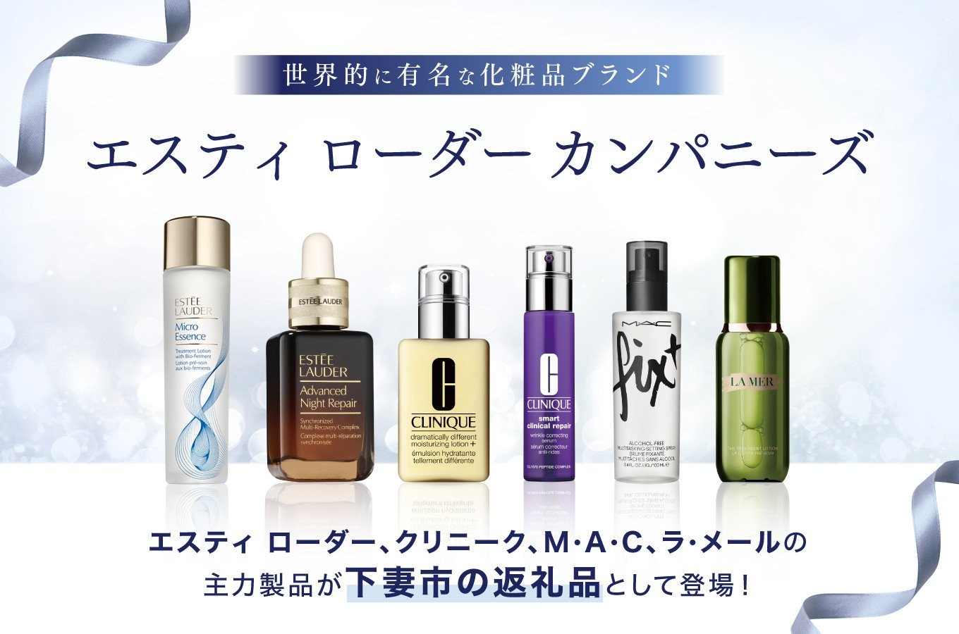 世界的に有名な化粧品ブランドであるエスティ ローダー、クリニーク、M·A·C、ラ・メールの4ブランドの主力製品が、返礼品として登場! 4ブランドが提供するベストセラーの主力製品は、国内の美容家・美容エディターにも高く評価され、雑誌や化粧品評価サイトで数々の賞を受賞しています。 下妻工場で製造されたメイドインジャパンの製品を、より多くの消費者の皆様にお届けできるようになりました。2025年1月からは、日本発の新シリーズ「アクア チャージ」シリーズの新返礼品・新セット品も登場しました。