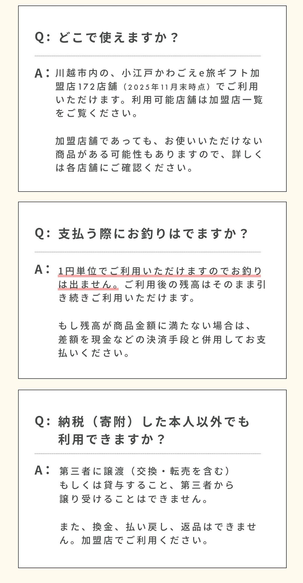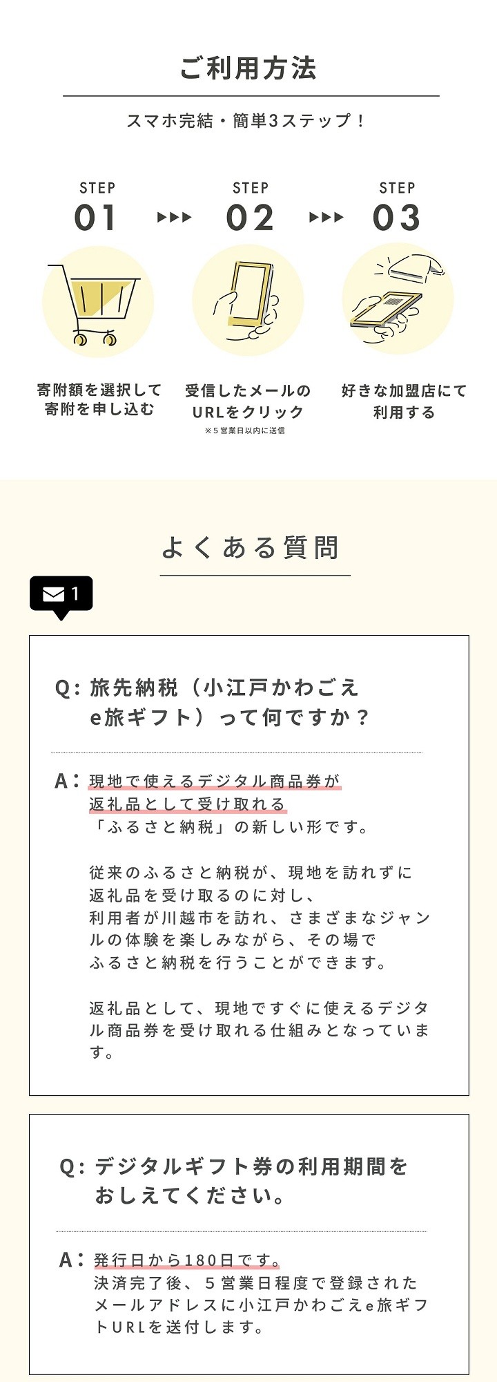 旅先納税・小江戸かわごえe旅ギフトとは? 川越市内の加盟店でお使いいただける電子商品券です。 飲食店・アクティビティ・宿泊施設などの店舗で、1円単位から使用が可能です。 ぜひ旅先納税を利用して川越観光を楽しんでください! 小江戸かわごえe旅ギフト発行の流れ (1)ポータルサイトから「旅先納税・小江戸かわごえe旅ギフト」を返礼品として選択し寄附を申し込みます。 (2)入金を確認してから5営業日ほどで登録いただいたメールアドレスへ”小江戸かわごえe旅ギフト”のURLが記載されたメールが届きます。(発行までに5営業日ほどかかりますので、ご注意ください。) ※メールアドレスをPCなどに設定されている場合は、適宜スマートフォンへメールを転送しご利用ください。 (3)URLをタップすると小江戸かわごえe旅ギフトが表示されますので、加盟店にてご利用ください。 ※すぐにご利用されない場合は、メールを保管又は小江戸かわごえe旅ギフトのページをブックマークに保存してください。 ●小江戸かわごえe旅ギフト加盟店一覧(以下のURLからご確認ください。) https://e-tabi.koedotabigift.jp/shop/ 関連キーワード:券 金券 人気 おすすめ
