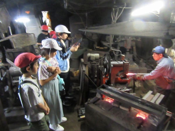 工場を訪れ、鉋(かんな)や鑿(のみ)の製作の様子を見学したり、職人の方からお話を聞いたりします。真っ赤になった地金と鋼を叩いて接続する工程など、その技と迫力に驚かされ、与板打刃物のすばらしさや職人さんの熱い思いについて学習しています。
