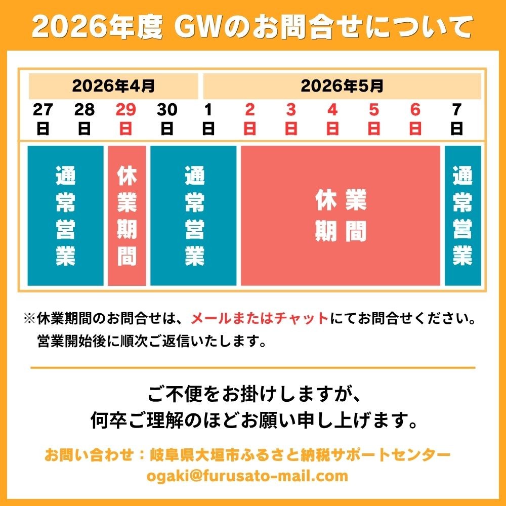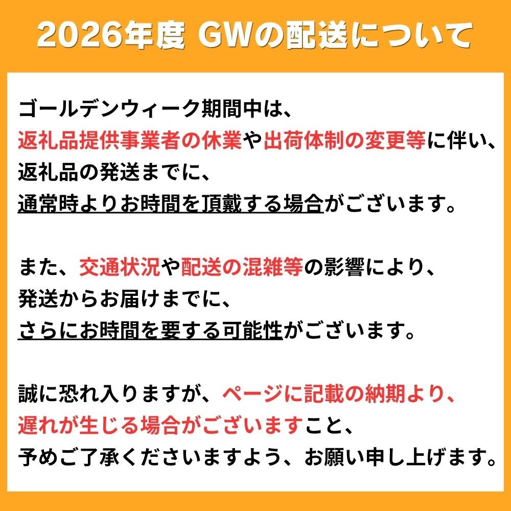 ゴールデンウィーク期間中は、 返礼品提供事業者の休業や出荷体制の変更等に伴い、返礼品の発送までに、 通常時よりお時間を頂戴する場合がございます。 また、交通状況や配送の混雑等の影響により、 発送からお届けまでに、 さらにお時間を要する可能性がございます。 誠に恐れ入りますが、ページに記載の納期より、 遅れが生じる場合がございますこと、 予めご了承くださいますよう、お願い申し上げます。