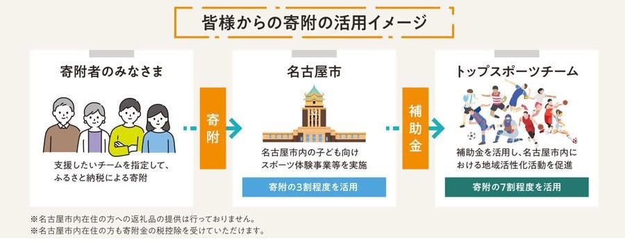 トップスポーツチーム等の地域活性化活動を促進し、スポーツによる地域の活性化・都市ブランドの向上を図るため、ふるさと寄附金を募集しています。 皆様からいただいた寄附から返礼品代などの経費を控除し、トップスポーツ等の地域活性化活動への補助や市のスポーツ振興事業に活用します。 トップスポーツチームとともにスポーツの力で名古屋を盛り上げましょう!