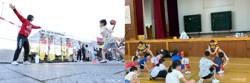 「リーグH」に参戦するHC名古屋は、世界に挑戦するトップアスリートの育成を目指しています。同時にクラブビジョン“We never walk alone, by HANDBALL, by SPORTS”を掲げ、その活動はトップアスリートだけでなく、小学生からマスターズまでの幅広い年齢層の人々が、日々ハンドボールを楽しんでいます。