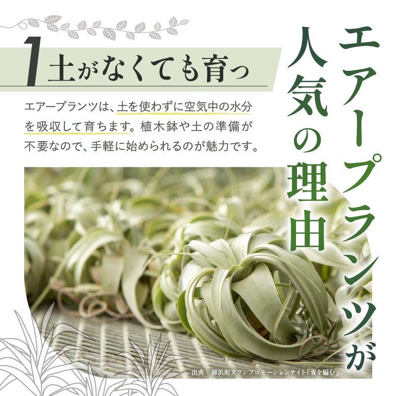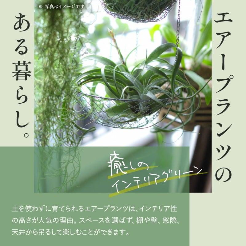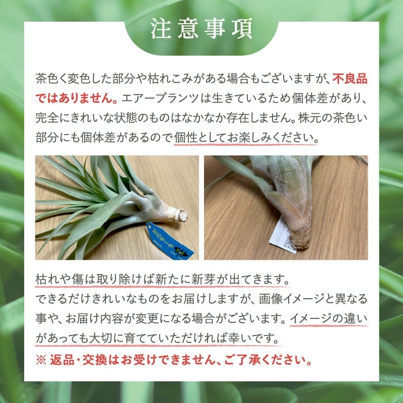 【エアープランツとよばれるティランジアの各種詰め合わせセット】 ※季節や生育状況などにより、品種が変更になる場合もございます。 【注意事項】 お届けしたエアープランツの中には、茶色く変色した部分や枯れこみがある場合もございますが、 不良品ではございません。 エアープランツは生きているため個体差があり、完全にきれいな状態のものはなかなか存在しません。 株元の茶色い部分につきまして、個体差があるので個性としてお楽しみください。 枯れや傷は取り除けば新たに新芽も出てきます。 なるべくきれいなものをお届けできるようこころがけていますが、画像イメージと異なる事もありお届け内容も変更になる場合がございます。 イメージの違いがあっても大切に育てていただければ幸いでございます。 ※返品や交換等はお受けできません。ご了承ください。 ※季節の変化で品種の変動あり。