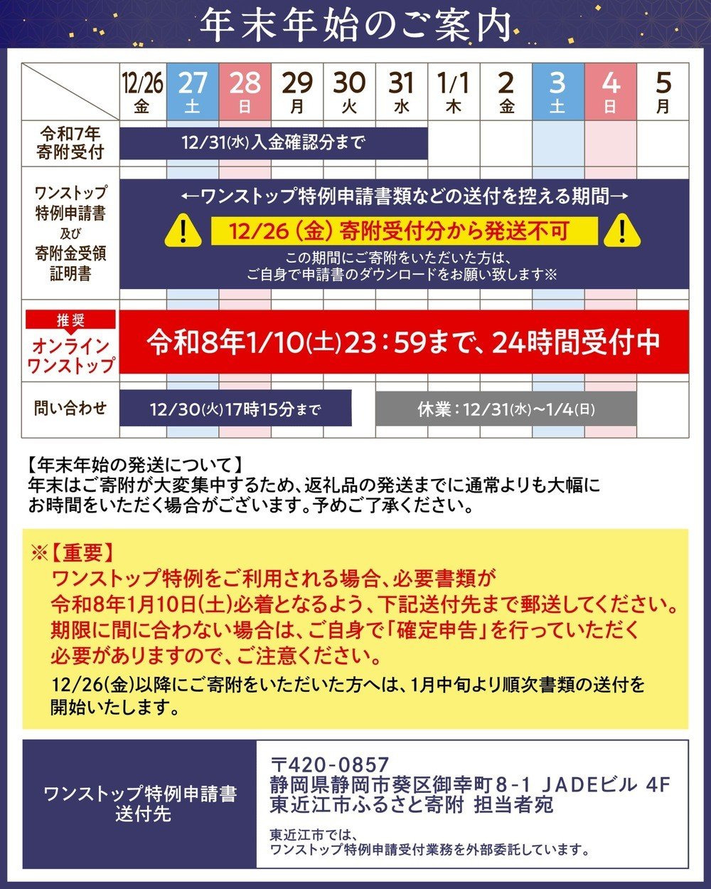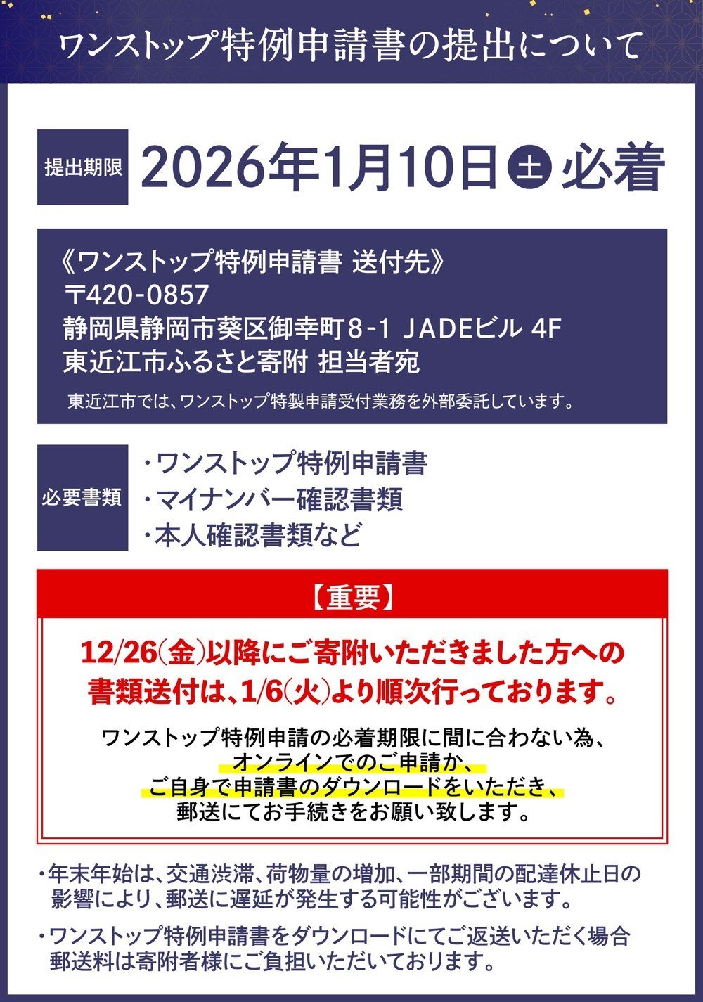 ※東近江市では、ワンストップ特例申請受付業務を外部に委託しております。自治体や、寄附者様問い合わせ窓口では、ワンストップ特例申請受領の処理ができかねますので、書類は必ず上記住所(静岡県)宛へお送りください。