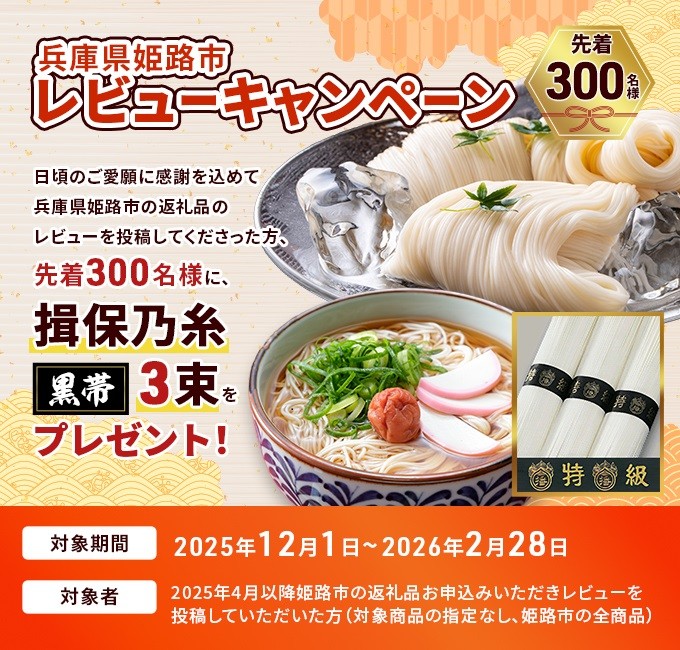姫路市にふるさと納税をし、返礼品のレビューを投稿していただいた方に播州素麺「揖保乃糸・特級品」(黒帯)をプレゼントするキャンペーンを実施しています。 「 美味しかった!」「デザインが素敵!」「使いやすい!」など、多くの方に姫路市の地場産品の魅力が伝わるような、温かなご声援やご感想をお待ちしております。 キャンペーンの参加条件をご確認の上、奮ってご参加ください!