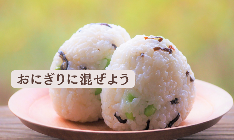 写真のおにぎりはえごま油×塩昆布×枝豆