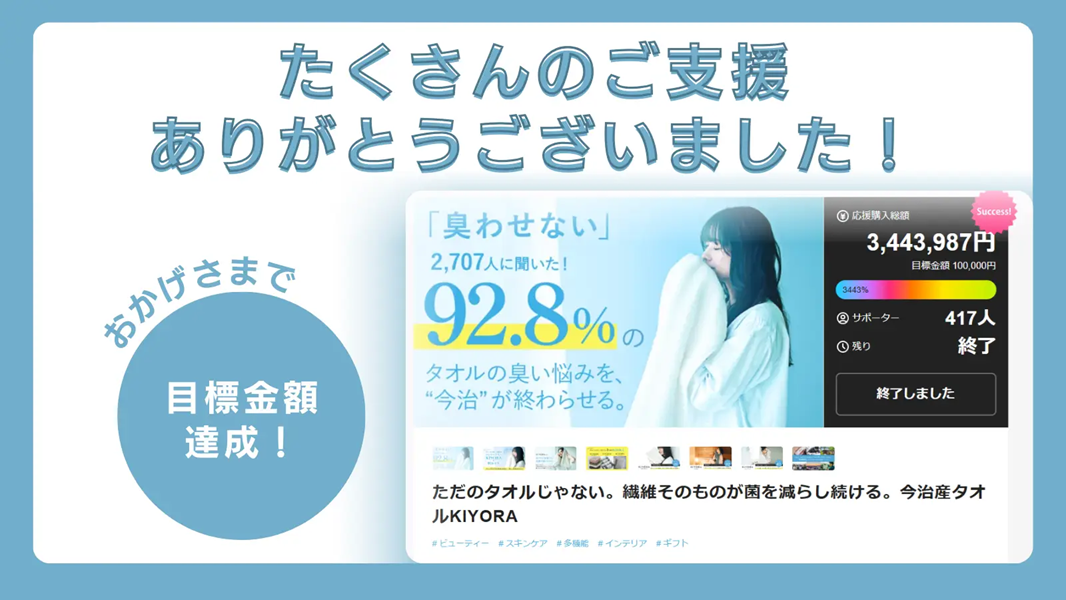 プロジェクト開始10分で目標金額を達成した話題のタオル!