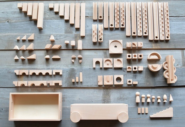 ビー玉転がしのレール、パーツのみのセットです。積み木と一緒に遊んでいただけます