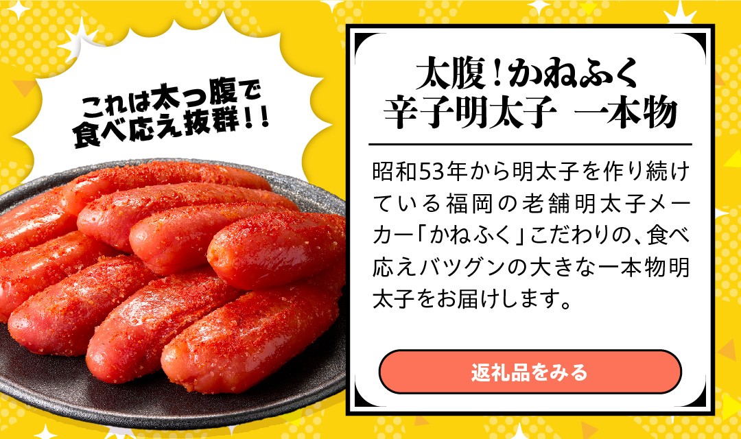 特徴:昭和53年から明太子を作り続けている福岡の老舗明太子メーカー「かねふく」こだわりの、食べ応えバツグンの大きな一本物明太子をお届けします。