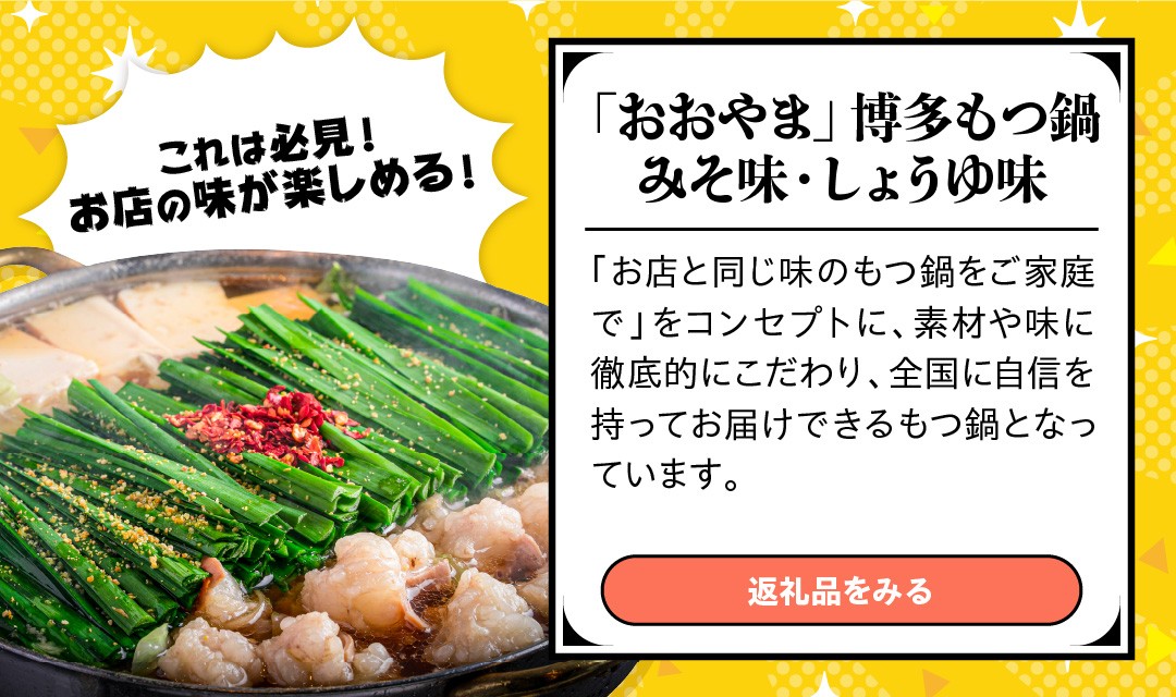 特徴:「超低温カット」というおおやまオリジナルの加工方法で、もつの脂と歯ごたえなどの食感が一番おいしく感じられるよう工夫しています。「お店と同じ味のもつ鍋をご家庭で」をコンセプトに、素材や味に徹底的にこだわり、全国に自信を持ってお届けできるもつ鍋となっています。