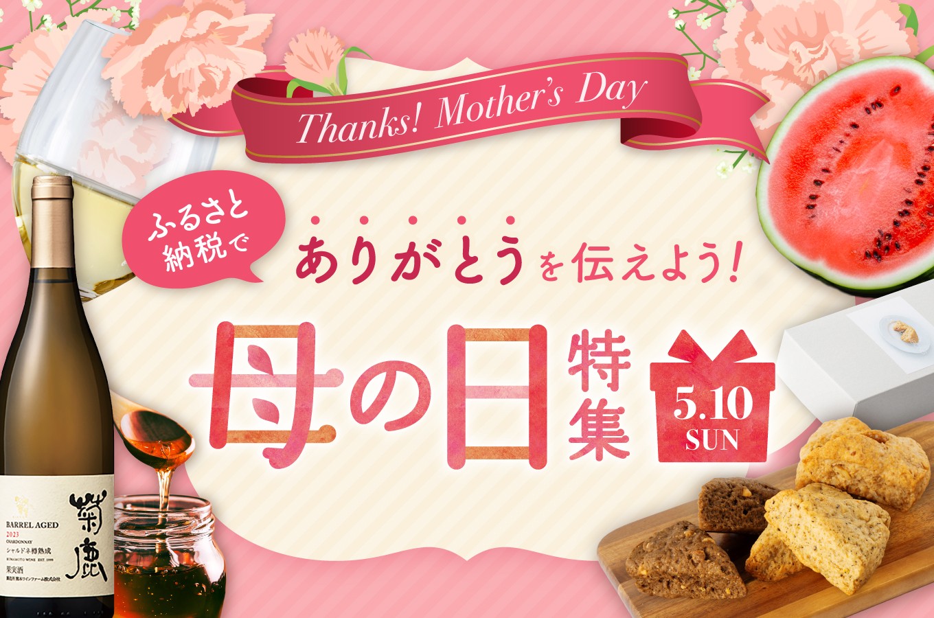 今年の母の日は、熊本県山鹿市から届く「とっておき」を贈りませんか? 豊かな自然と伝統が息づく山鹿の地で、ひとつひとつ丁寧に作られた心満たされる逸品。 日頃の感謝を込めて贈る、ふるさと納税という新しいギフトのカタチ。 山鹿の美味しいものにのせて、日頃の想いをぜひ伝えてみてください。