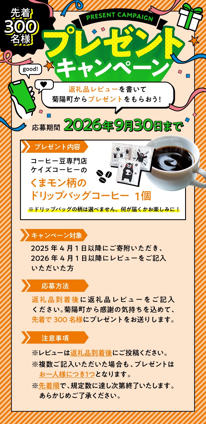 菊陽町に2025年4月1日以降にご寄附いただき、2026年4月1日以降にレビューを書いていただいた方先着300名様に 「くまモン ドリップバッグコーヒー」をプレゼント! レビューを書いていただいた方に先着300様限定! 熊本といえば、くまモン! そのくまモンと菊陽町の常時50種類近くの自家焙煎珈琲豆を扱う専門店とのコラボ商品!