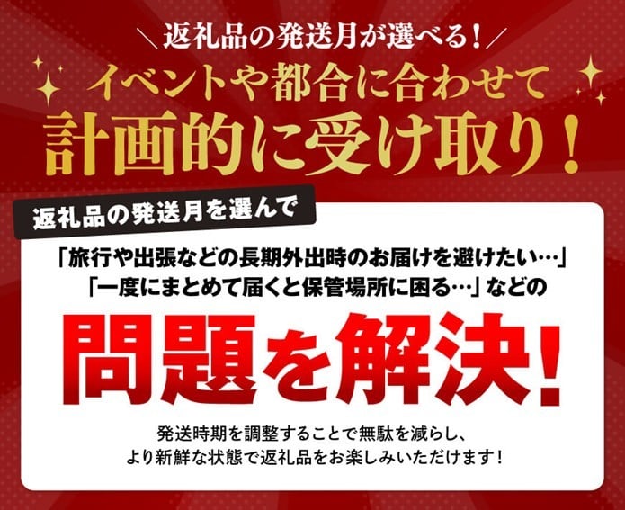 \返礼品の発送月が選べる/ イベントや都合に合わせて計画的に受け取り! 返礼品の発送月を選んで「旅行や出張などの長期外出時のお届けを避けたい・・・」「一度にまとめて届くと保管場所に困る・・・」などの問題を解決。 発送時期を調整することで無駄を減らし、より新鮮な状態で返礼品をお楽しみいただけます!