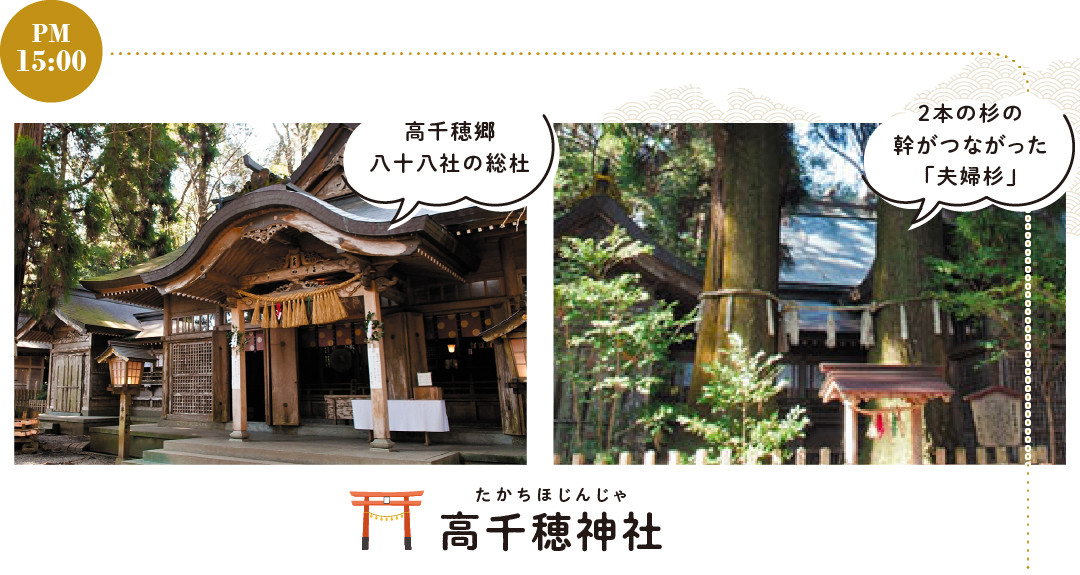 二本の杉の木がより合わさった夫婦杉は、高千穂神社の境内の地中に共通の根を張り、夫婦が手を取り合うように幹がつながっています。この夫婦杉の周りを愛する者と手を繋いで三周回ると、家庭円満、家内安全、無病息災、子宝祈願などのご利益があるとされています。ただし、回っている間に木の根につまづくとご利益が無くなってしまうのでご注意ください!