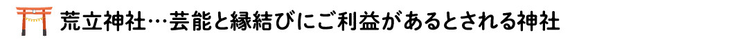 瓊々杵尊(ににぎのみこと)が天照大神の命を受けてこの国に降臨される途中で天孫一行の道案内をされた猿田彦命(さるたひこのみこと)と天鈿女命(あめのうずめのみこと)が結婚して住まわれた地と伝えられ、切り出したばかりの荒木を利用して急いで宮居を造ったため、“荒立宮”と名付けられたといわれています。このような言い伝えから縁結びに、ご利益があるとされています。