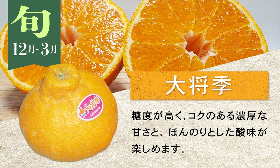 「大将季(だいまさき)」は、鹿児島県で生まれた希少な柑橘。デコポンのような見た目で、糖度が高く、酸味はまろやか。果汁たっぷりで、とろけるような甘さが広がります。手でむけて食べやすく、冬の贈り物にもぴったりです。